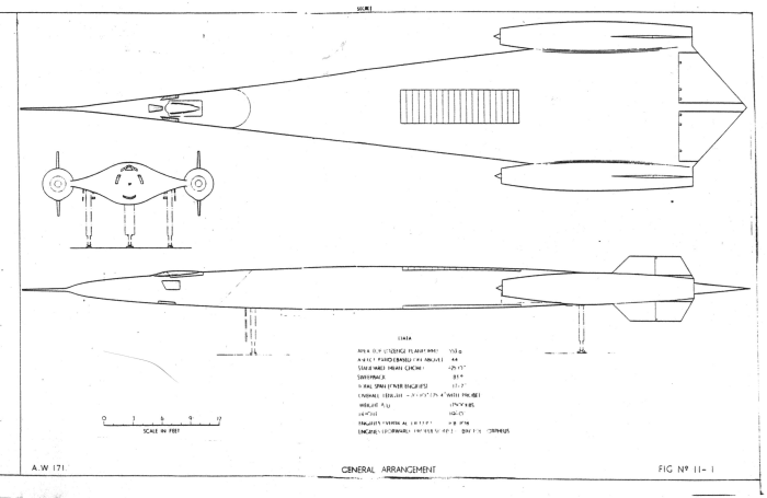 Description: Proposed by Dr A.A. Griffith of Rolls-Royce, the AW.171 was a supersonic VTOL aircraft designed in response to the Ministry of Supply (MoS) ER.161T specification. It featured two Bristol Orpheus turbojet engines for horizontal thrust and ten Rolls-Royce RB.108 VTOL lift engines for vertical thrust, enabling it to fly at supersonic speeds of up to Mach 2 (2,469.6 km/h). The aircraft had a very narrow fuselage, where the pilot had to lie in a prone position in order to minimise drag. Further development was cancelled in 1957 before a prototype could be flown.